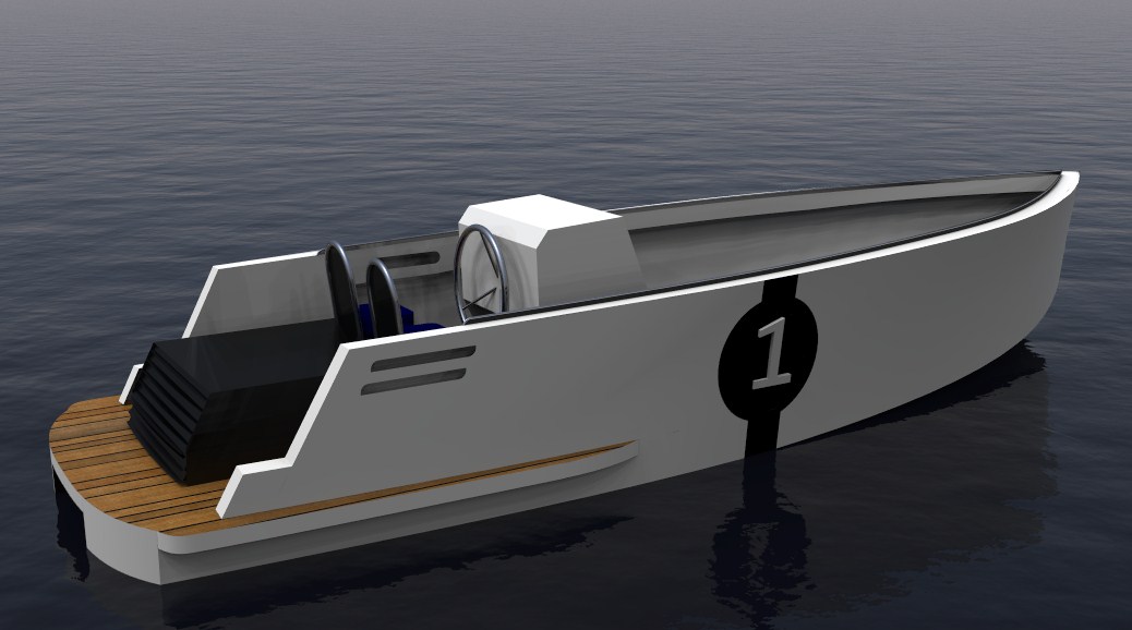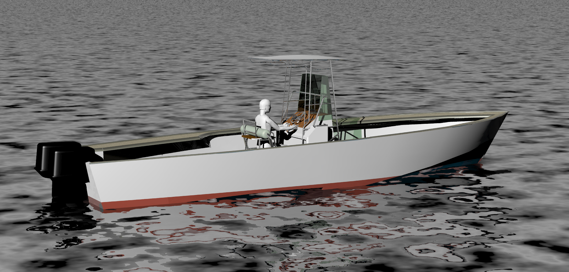 Looks cool, especially the hull and boarding walk through transom. What kind of power plant and power are you thinking of?