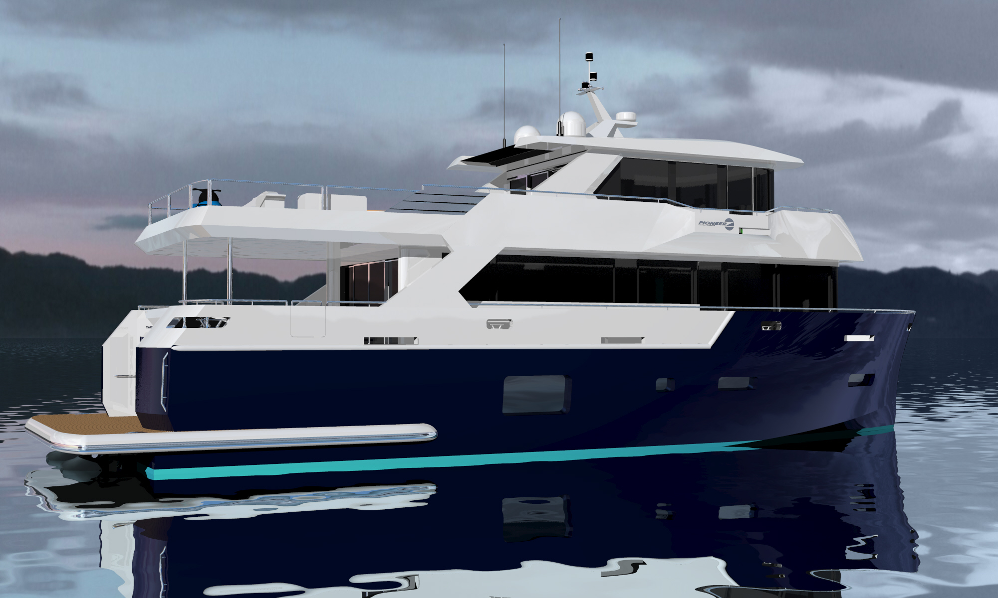 Looks cool, especially the hull and boarding walk through transom. What kind of power plant and power are you thinking of?