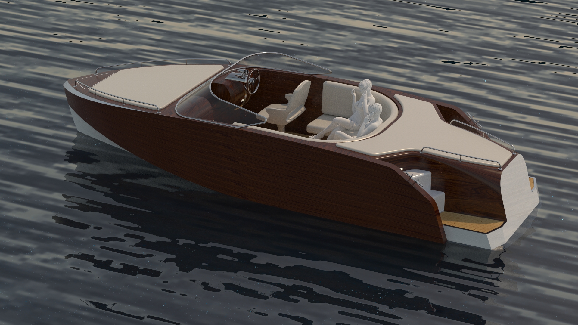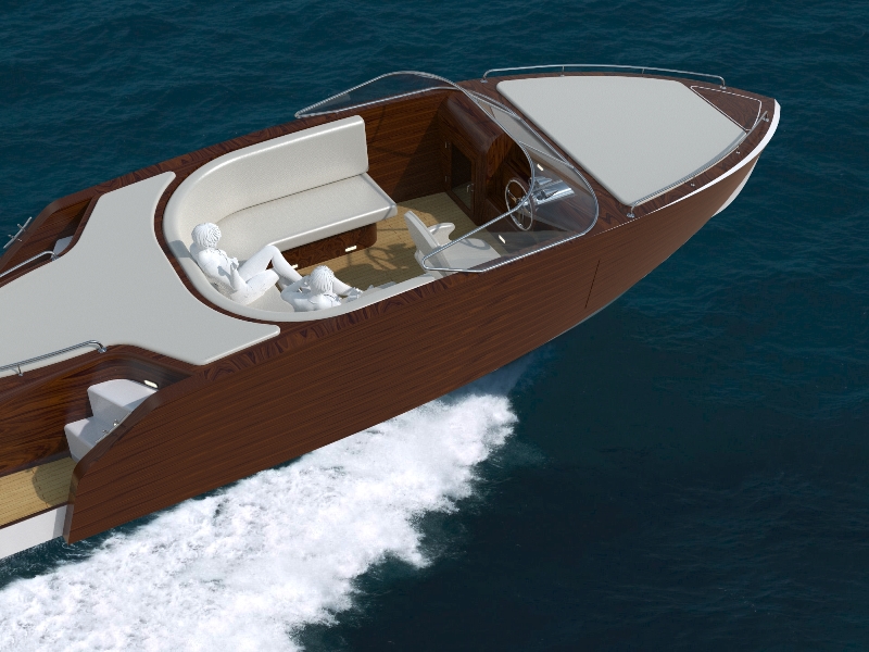 Looks cool, especially the hull and boarding walk through transom. What kind of power plant and power are you thinking of? -