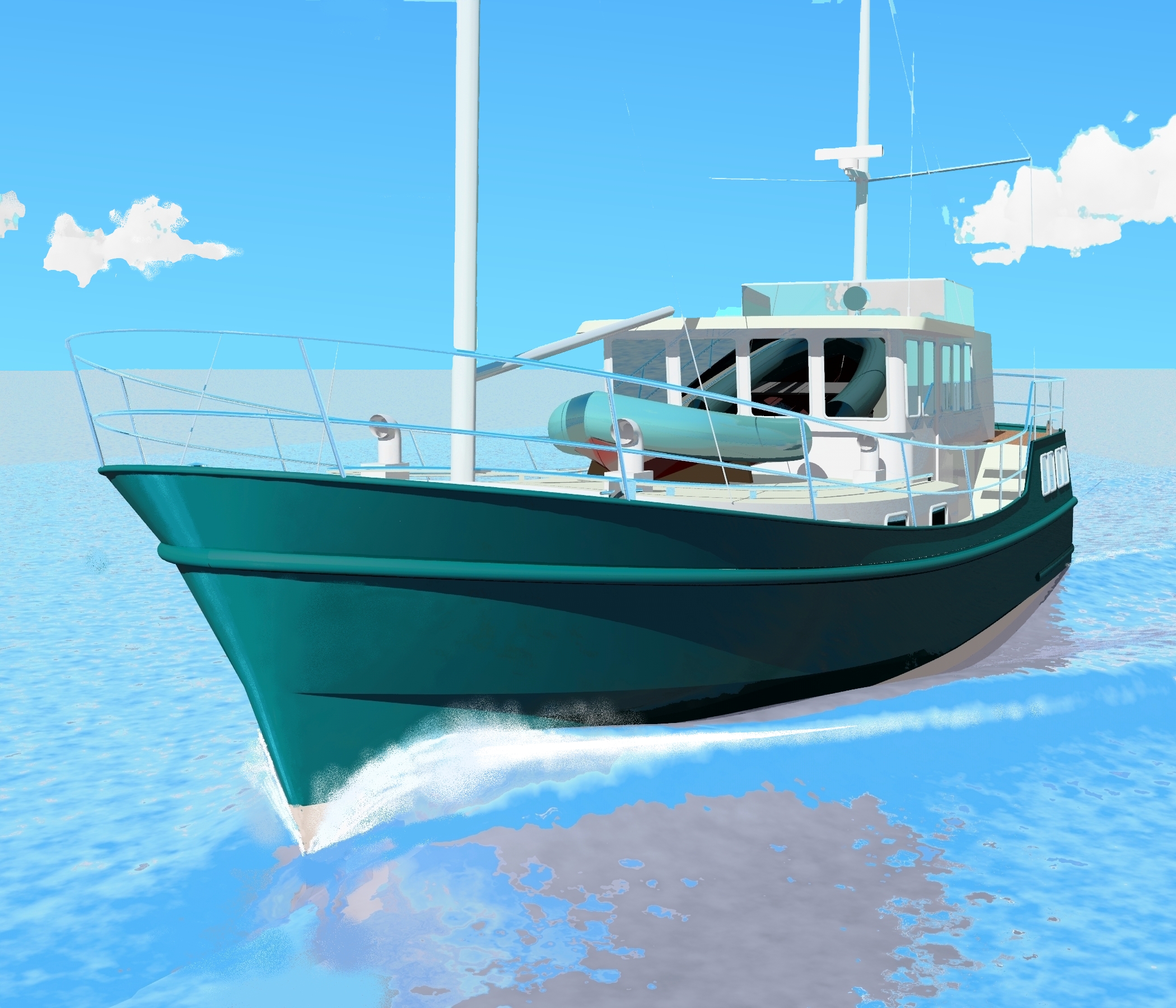 Looks cool, especially the hull and boarding walk through transom. What kind of power plant and power are you thinking of?