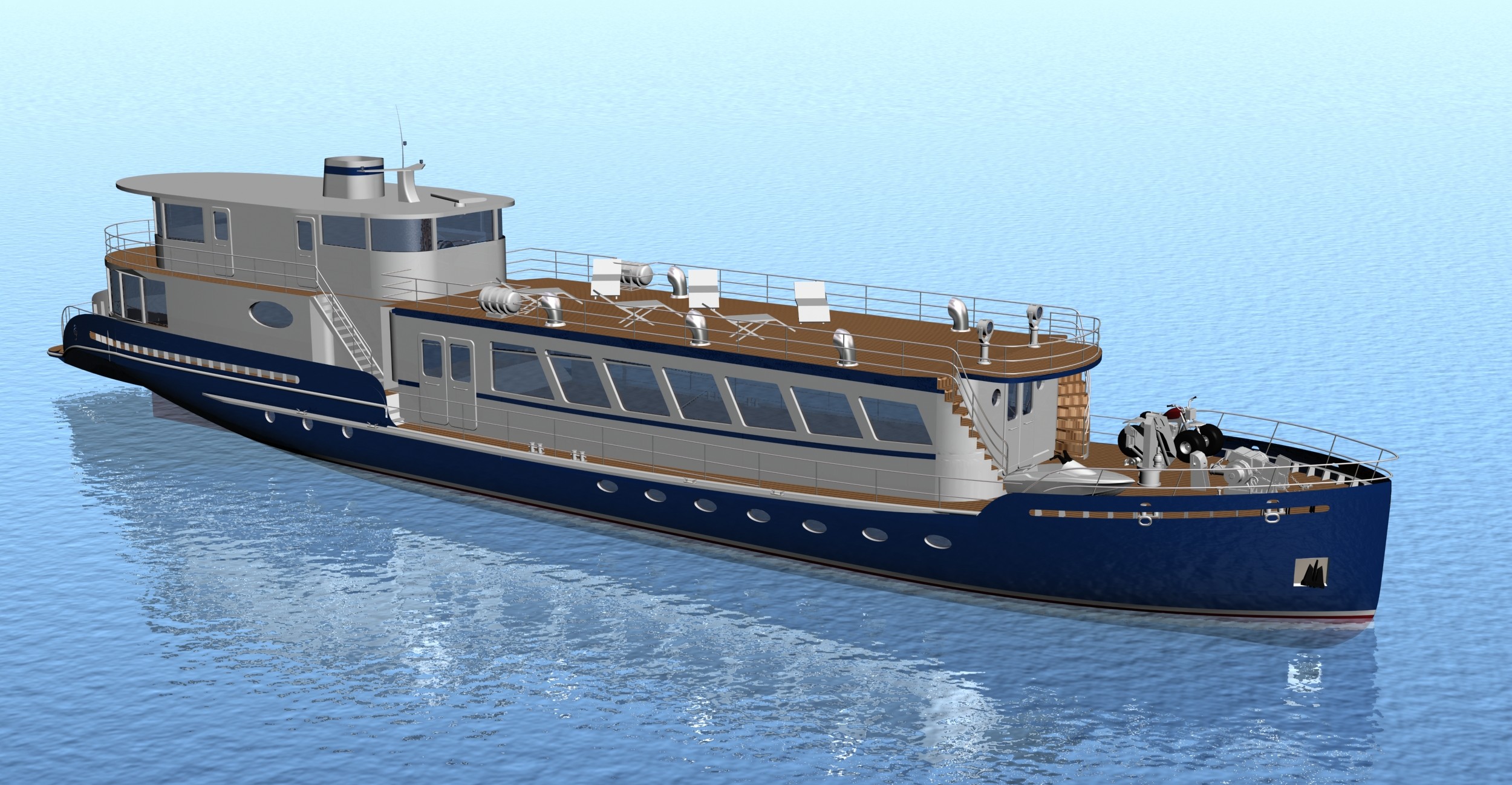 Looks cool, especially the hull and boarding walk through transom. What kind of power plant and power are you thinking of?