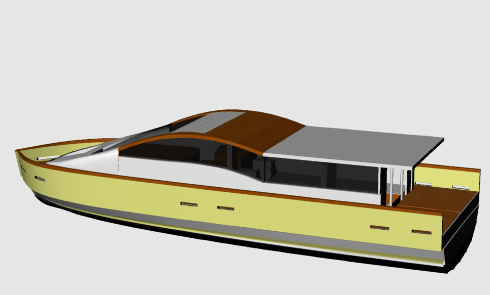 Looks cool, especially the hull and boarding walk through transom. What kind of power plant and power are you thinking of?